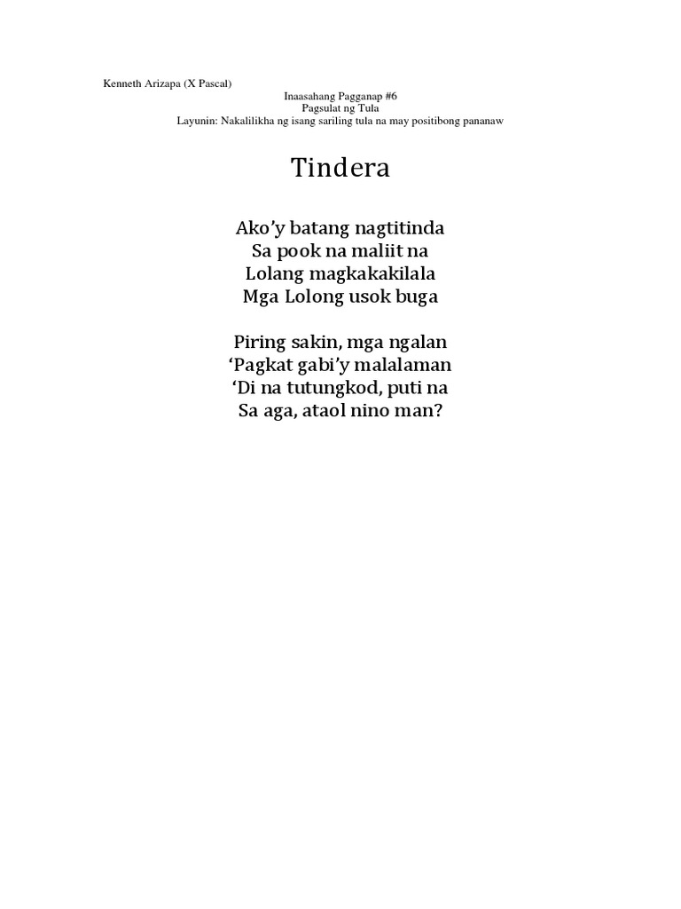 Tula Paksa Pagsulat Ng Tula Habi Ng Salita Pagsibol Ng Tula Mga Layunin Inaasahan Ang Mga Studocu